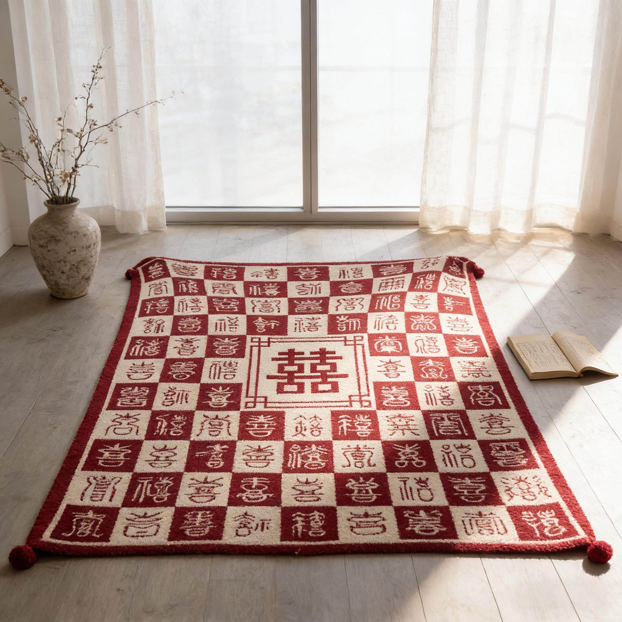 百喜图婚庆毛毯红色棋盘格婚房布置结婚氛围毯喜庆装饰毯新婚送礼