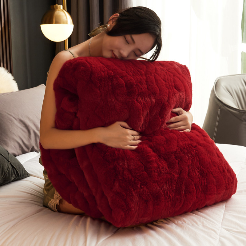 高端婚庆毛毯加厚仿兔毛艺术毯双人结婚酒红色盖毯秋冬季保暖毯子
