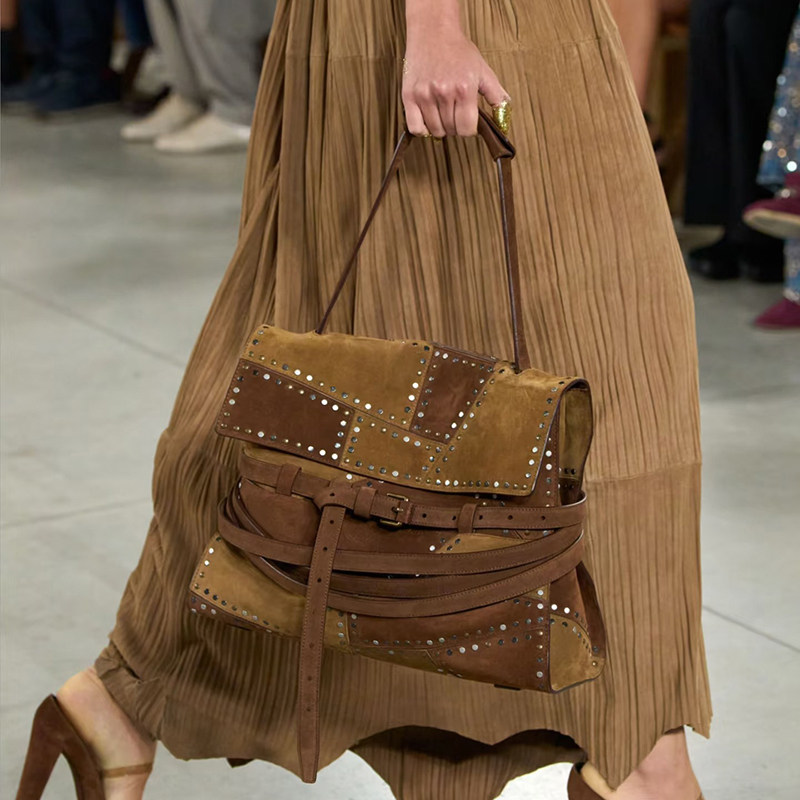 小众设计麂皮托特包铆钉皮带扣大容量手提包复古拼接斜挎包女包潮