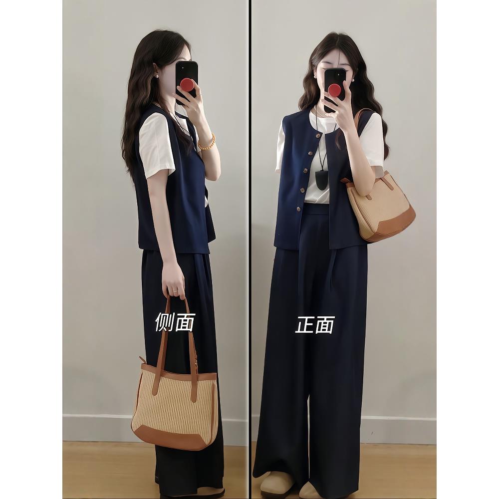 夏季穿搭一整套大码胖mm马甲叠穿上衣阔腿裤气质减龄高级三件套装