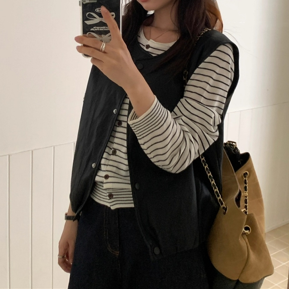 大码胖MM马甲针织背心女春秋季条纹v领撞色学院风无袖马甲衬衫女