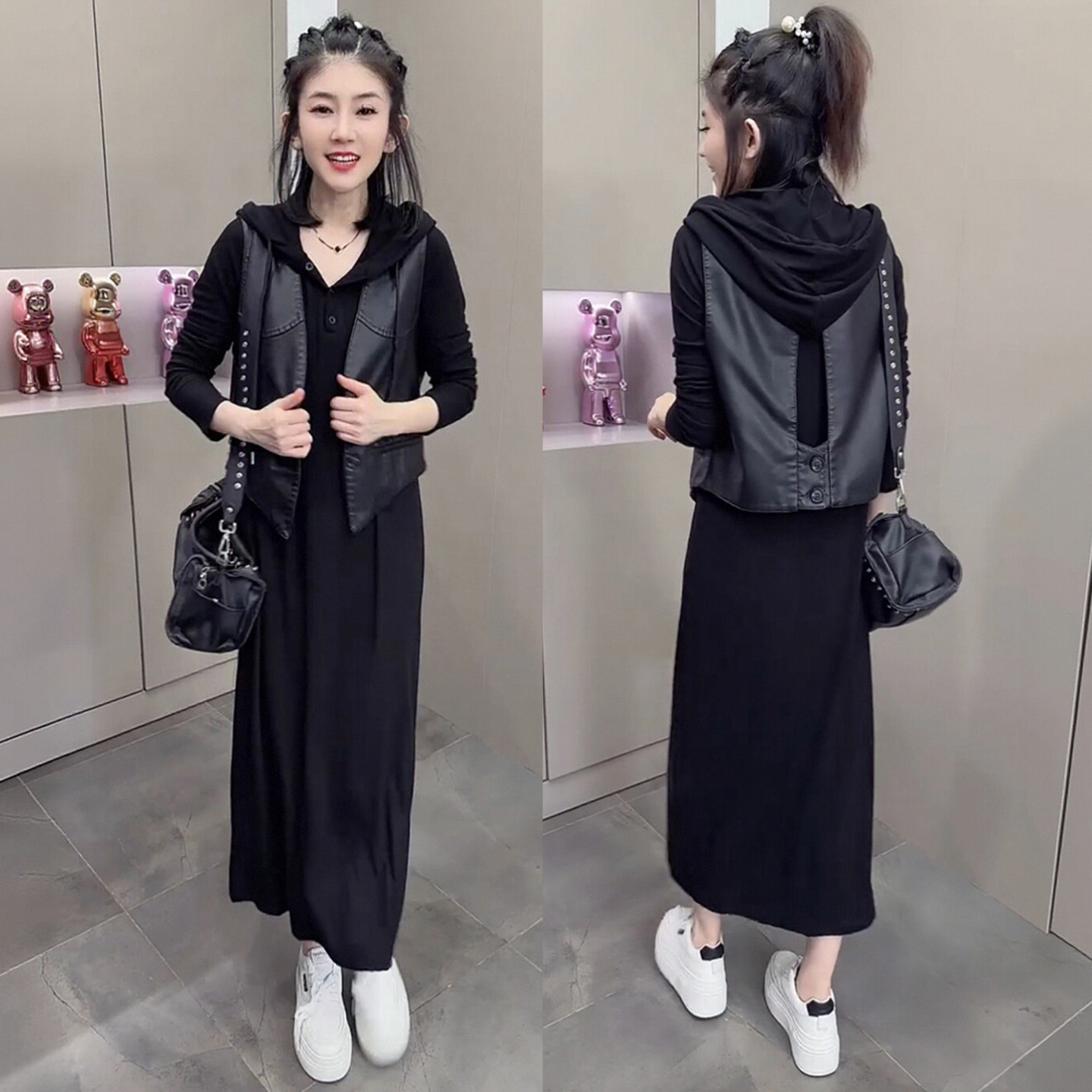 外贸出口转内销秋季穿搭一整套大码胖mm马甲外套连帽连衣裙子气质