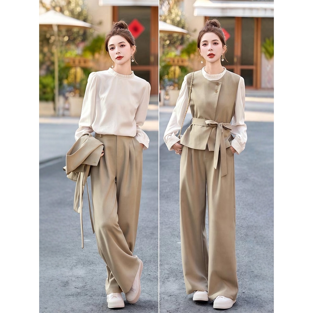 早秋穿搭一整套大码胖mm马甲衬衫直筒裤子气质高级叠穿三件套装女