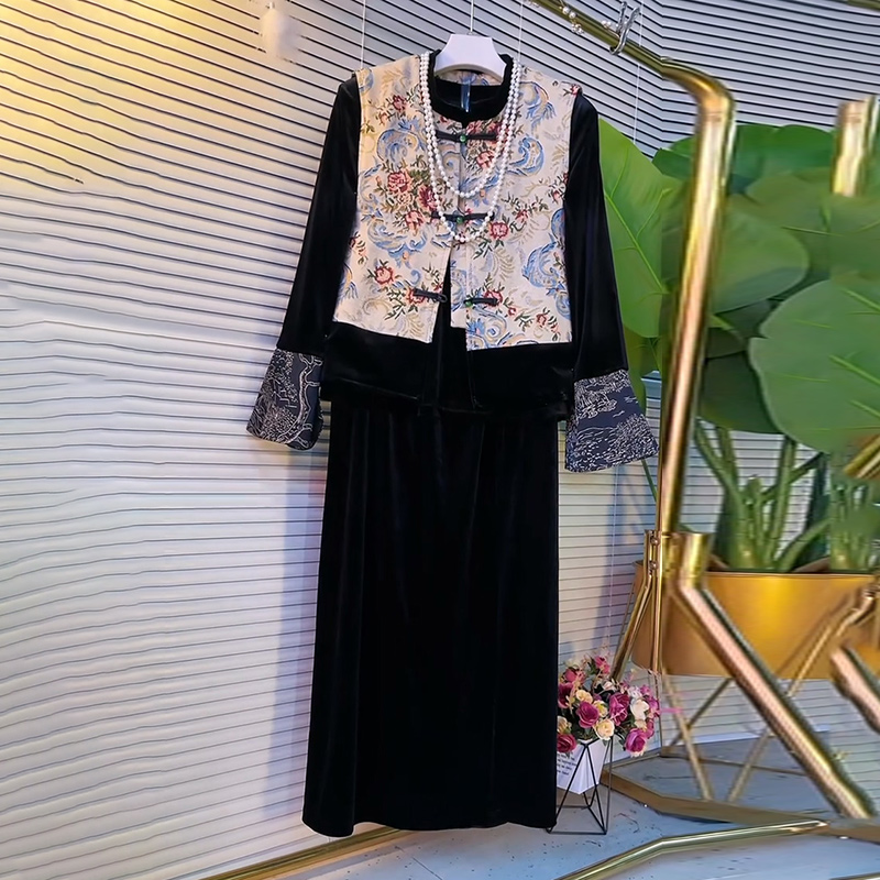 新中式国风套装大码女装200斤胖MM马甲丝绒衫半身丝绒裙三件套