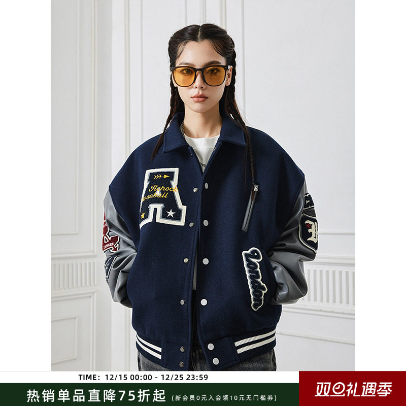 马登美式学院风棒球服夹克复古撞色刺绣外套百搭毛呢短上衣秋季女