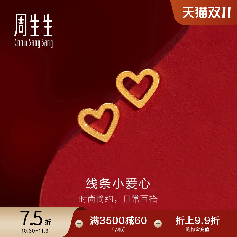 周大生怦然心动黄金耳钉小心意足金5G爱心几何耳饰生日礼物送女友