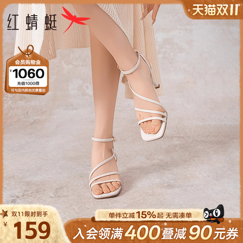 红蜻蜓高跟凉鞋女2025夏季新款女鞋法式真皮白色细跟一字带凉跟鞋