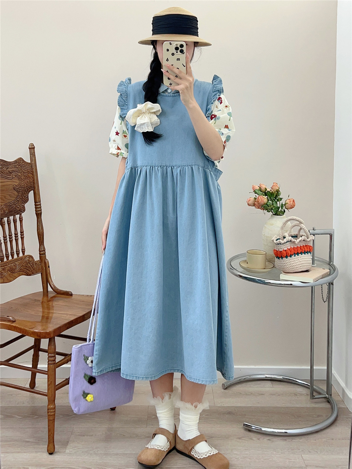梦箱子2024夏新款甜美木耳边宽松牛仔裙女套头高腰背心长裙连衣裙
