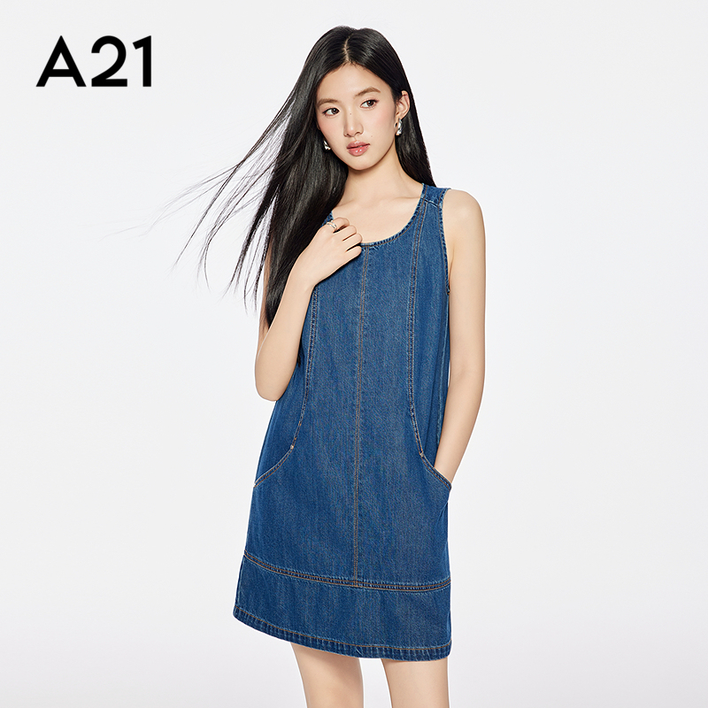 A21女装浅中蓝无袖宽松牛仔裙2025夏季新款简约圆领套头A字连衣裙