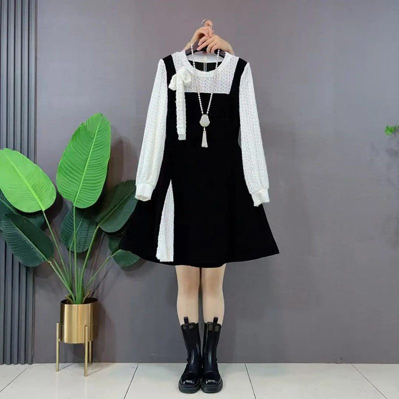 加肥拼蕾丝领长袖假两件淑女裙大码女装韩版减龄显瘦名媛风连衣裙