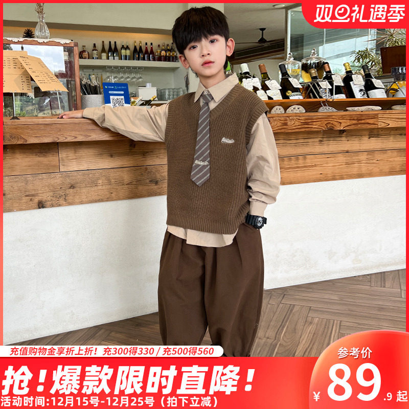 男童春秋装英伦风套装男宝宝复古格子衬衫坎肩马甲婴儿宽松休闲裤