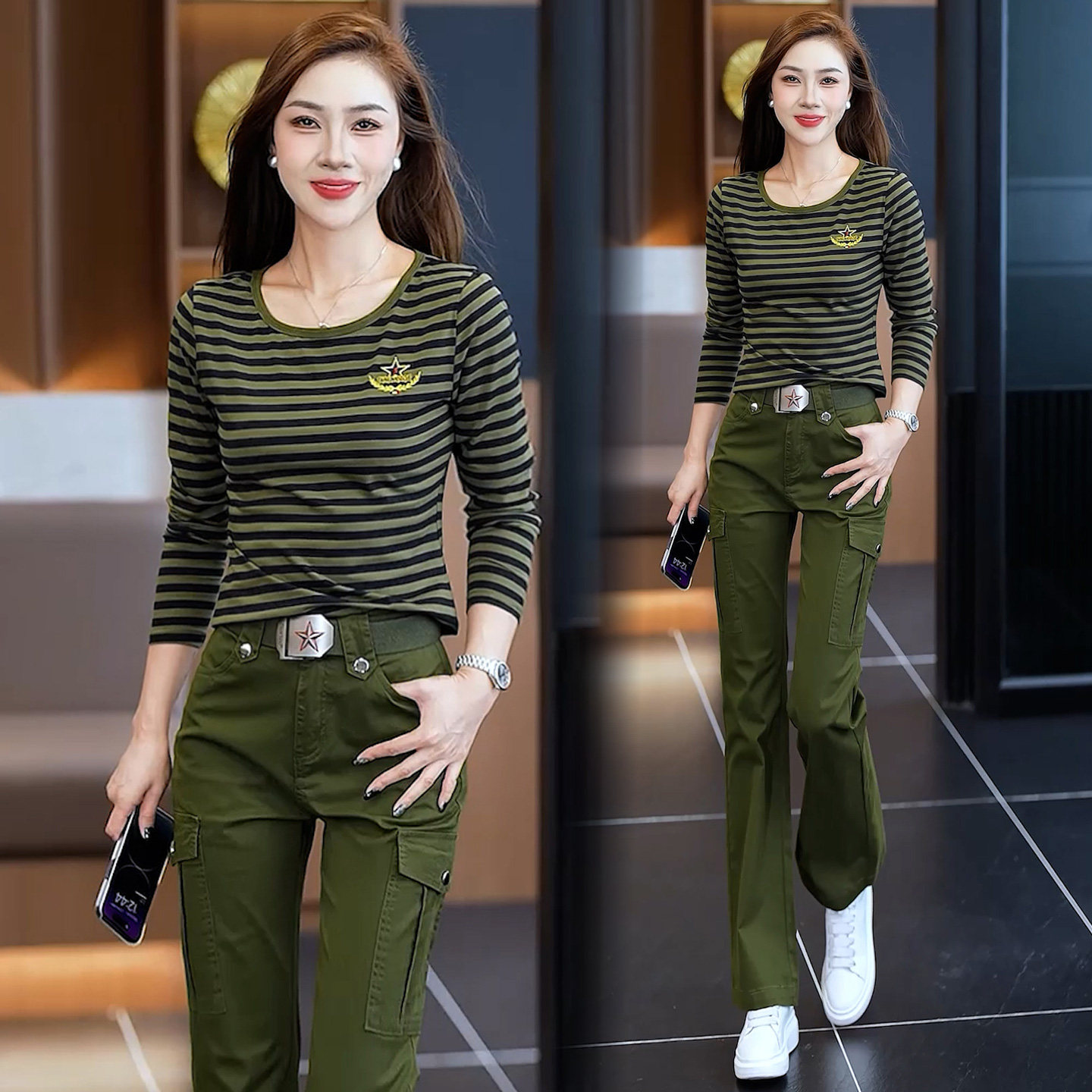 上衣女士2026新款秋季迷彩套装巨好看工装裤军绿色演出服t恤长袖
