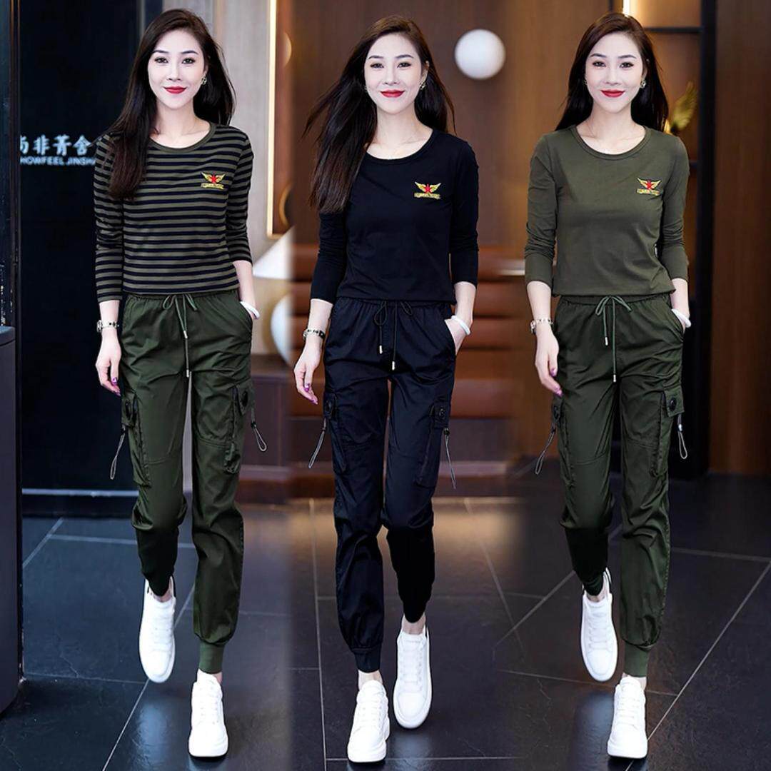 时尚迷彩服套装休闲工装军绿两件套春秋新款大码女士迷彩长袖t恤