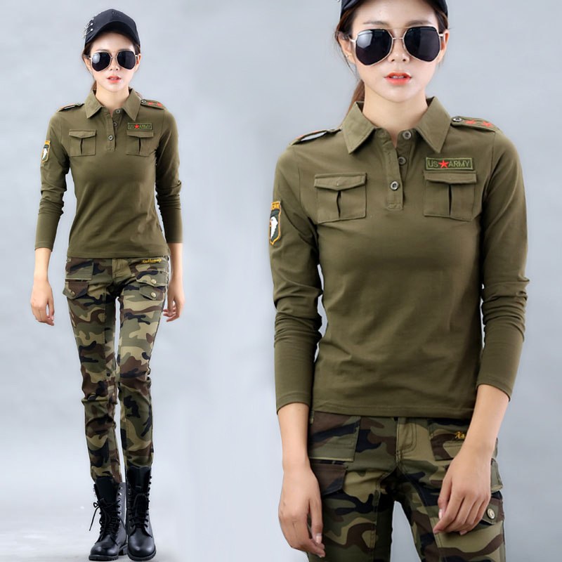 春款水兵舞蹈服装迷彩服女 胸前红五角星翻领长袖T恤女士新款大码