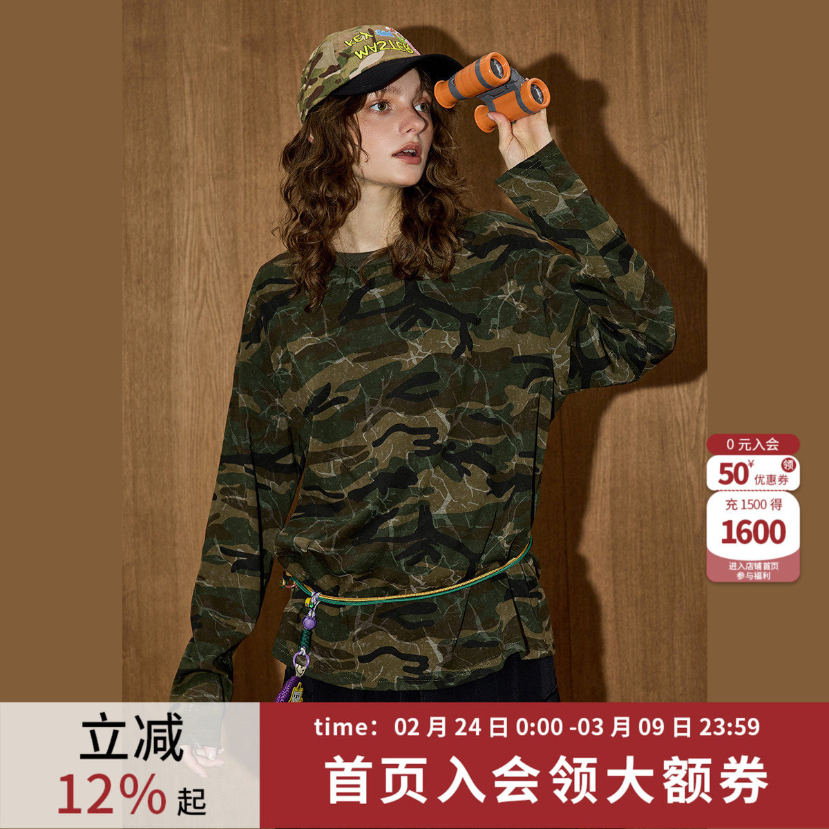 coolhut美式复古宽松迷彩长袖2025秋季女式时尚迷彩长袖T恤