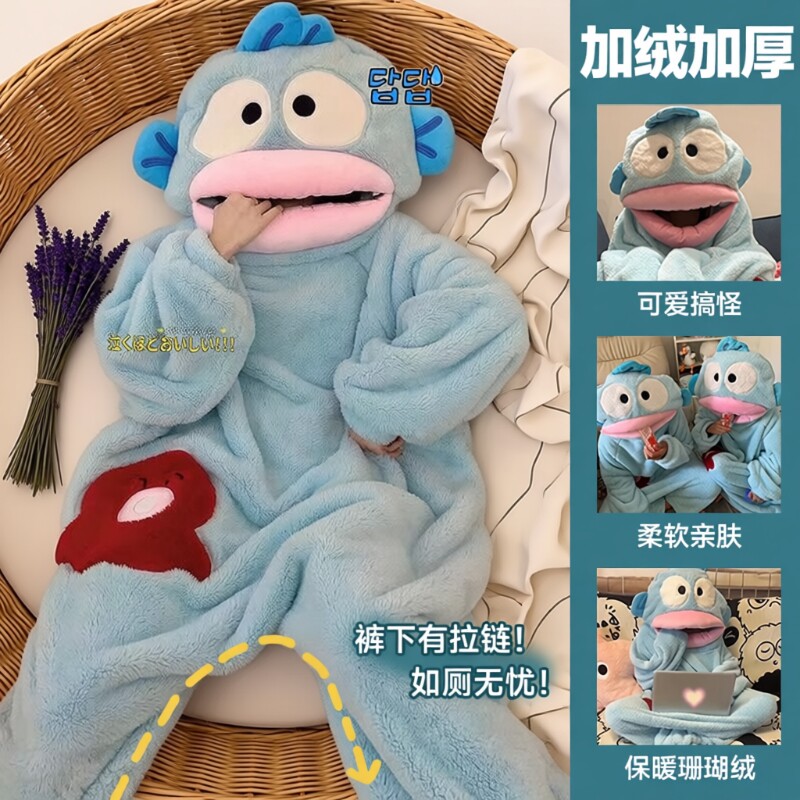 大嘴怪珊瑚绒丑鱼连体睡衣女款冬季男加绒加厚可爱搞怪睡袍家居服