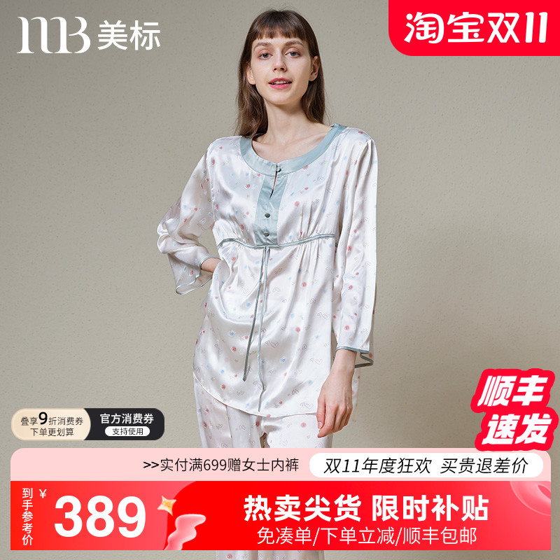 美标春秋女士长袖真丝睡衣两件套装100%桑蚕丝丝绸高档薄款家居服