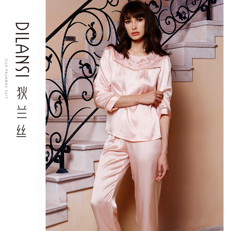 狄兰丝重磅真丝睡衣两件套装女长袖长裤镂空绣花丝绸家居服可外穿