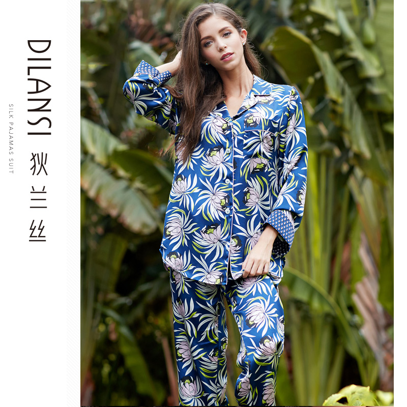 [清仓]真丝睡衣两件套装印花女士长袖桑蚕丝睡衣丝绸家居服春秋季