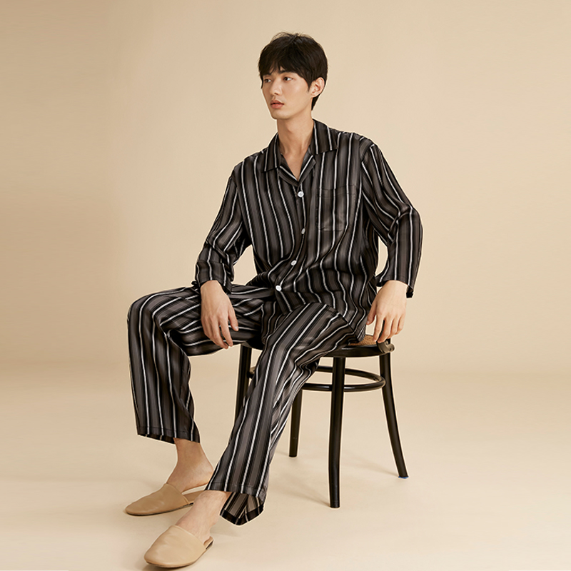 美标长袖真丝睡衣两件套装春夏季100%桑蚕丝绸时尚休闲家居服男士