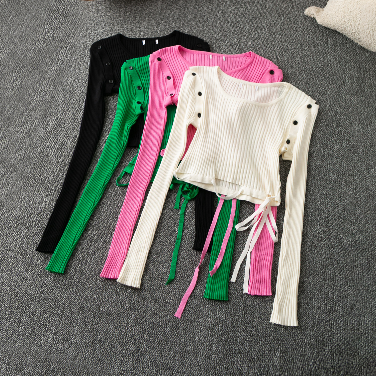 春秋外贸韩版新款 修身显瘦 袖子可拆卸 短款圆领长袖套头针织衫