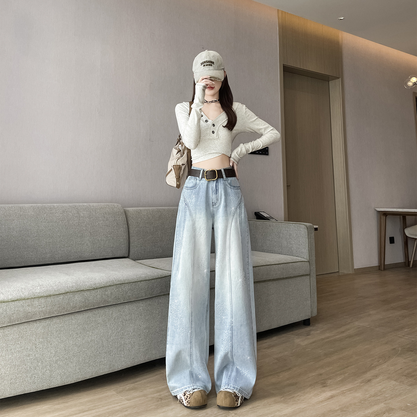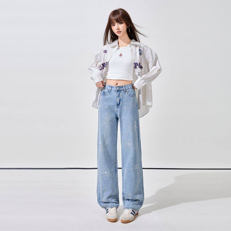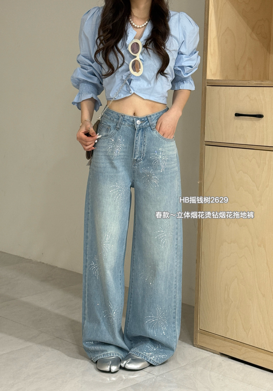 实拍早春设计感烟花烫钻闪钻牛仔裤女高腰直筒宽松显瘦阔腿长裤子