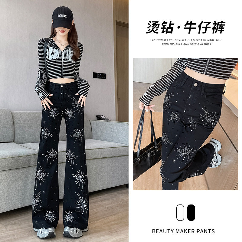 黑色烟花烫钻阔腿牛仔裤女2026春季新款小个子高腰显瘦弹力喇叭裤