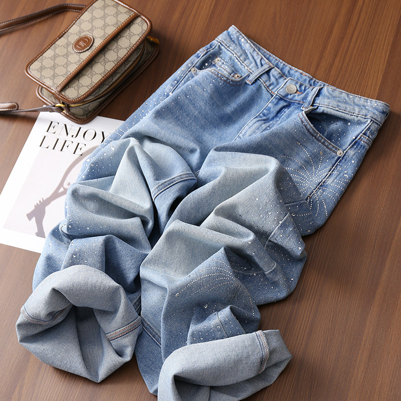 5608春季新款韩版气质百搭显瘦特色洗水烟花烫钻阔腿裤显瘦牛仔裤