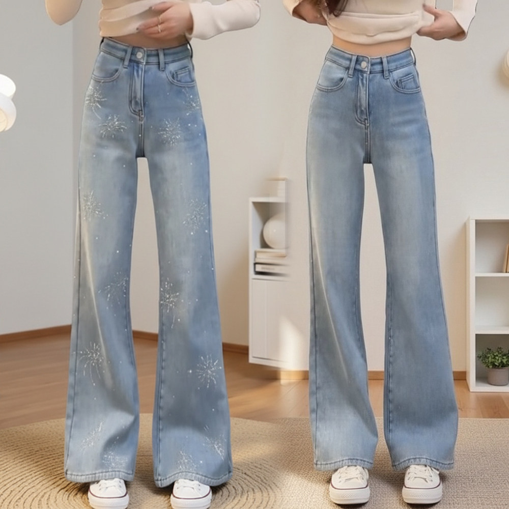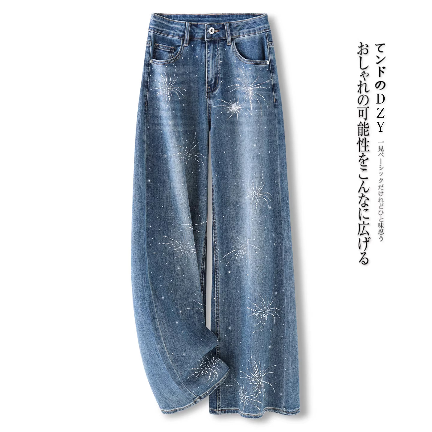时尚烟花烫钻阔腿牛仔裤女2026春季新款洋气高腰显瘦垂感直筒长裤
