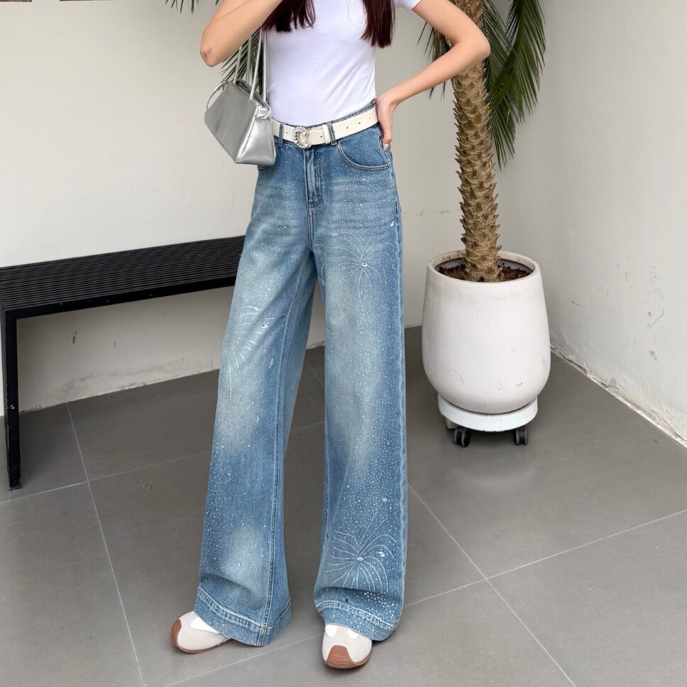 淘么淘 自带高光 重工爆闪烟花烫钻显瘦高腰阔腿牛仔裤长裤女新款