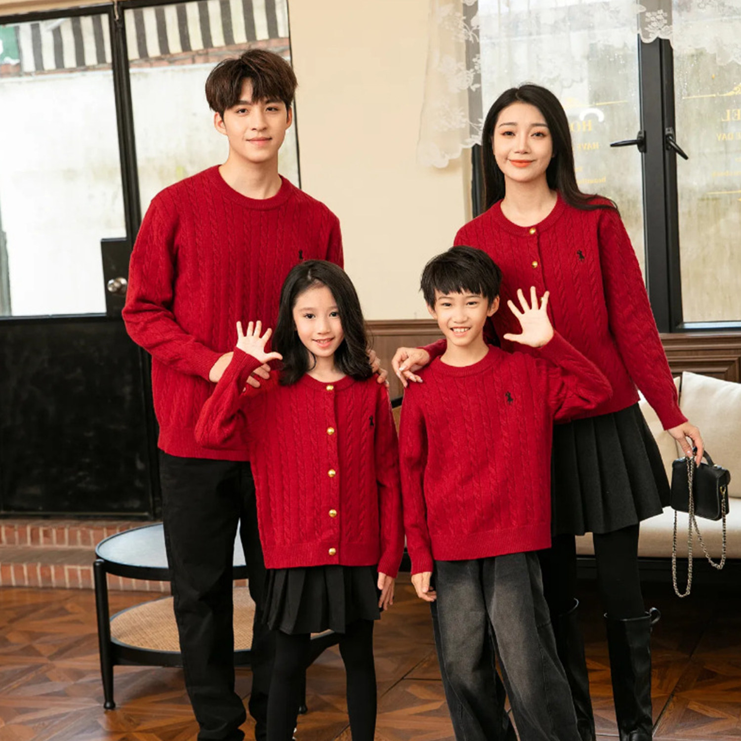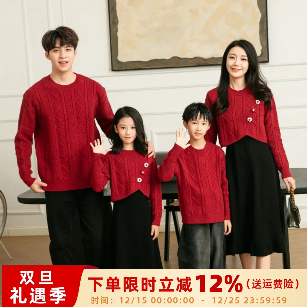 红色喜庆亲子装秋冬一家三口2025新款韩版加厚洋气母女装开衫毛衣