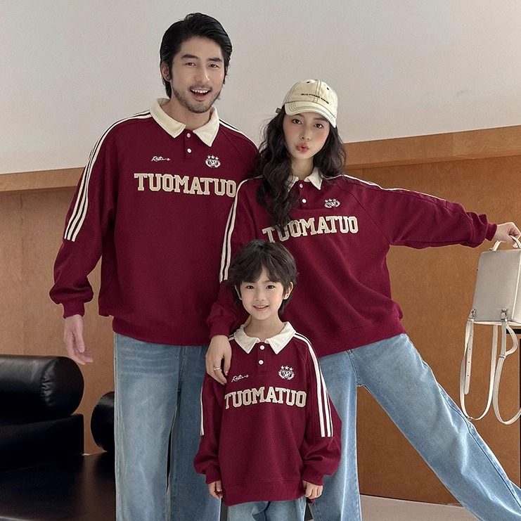 高端2025新款亲子装秋卫衣一家三口四口母子母女韩版洋气翻领红色