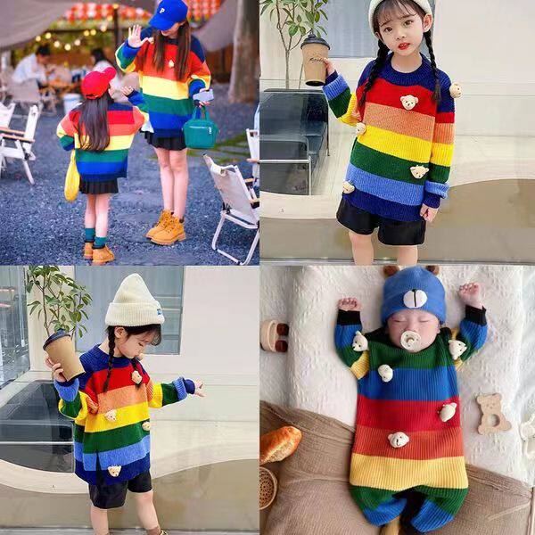 韩版秋冬亲子装毛衣一家三口母女婴儿卡通小熊条纹针织衫过年童装