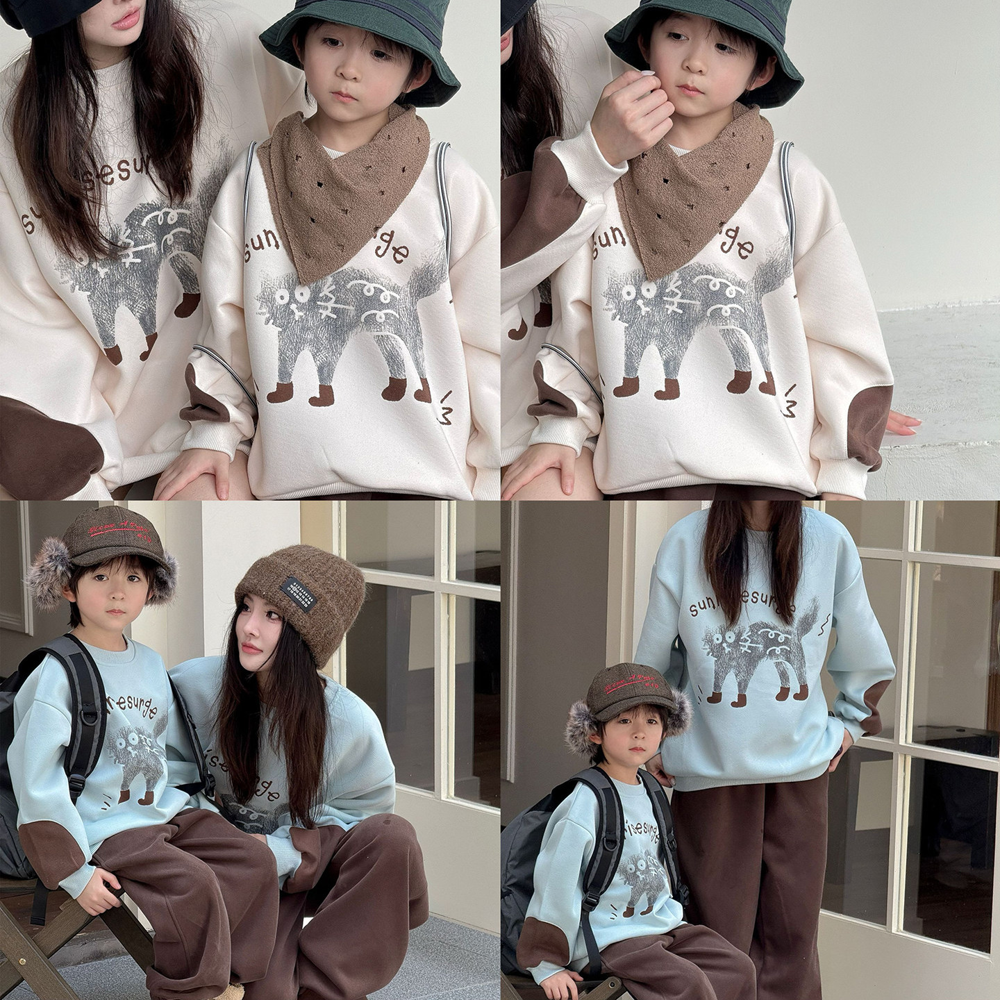 2025韩版炸街亲子装一家三口秋冬卡通母女装纯棉加绒长袖拜年卫衣