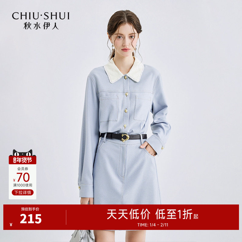 菲梦伊蓝色衬衫牛仔连衣裙女秋季复古简约时尚休闲收腰裙子送腰带