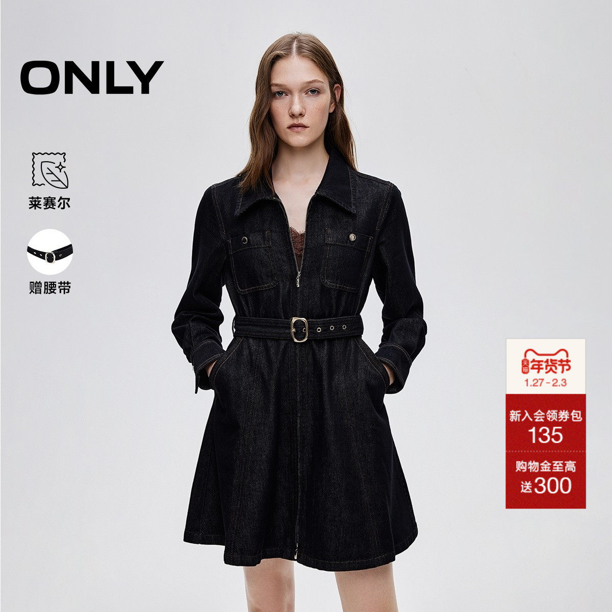 ONLY2025秋季新款通勤复古水洗腰带收腰翻领短裙牛仔连衣裙女