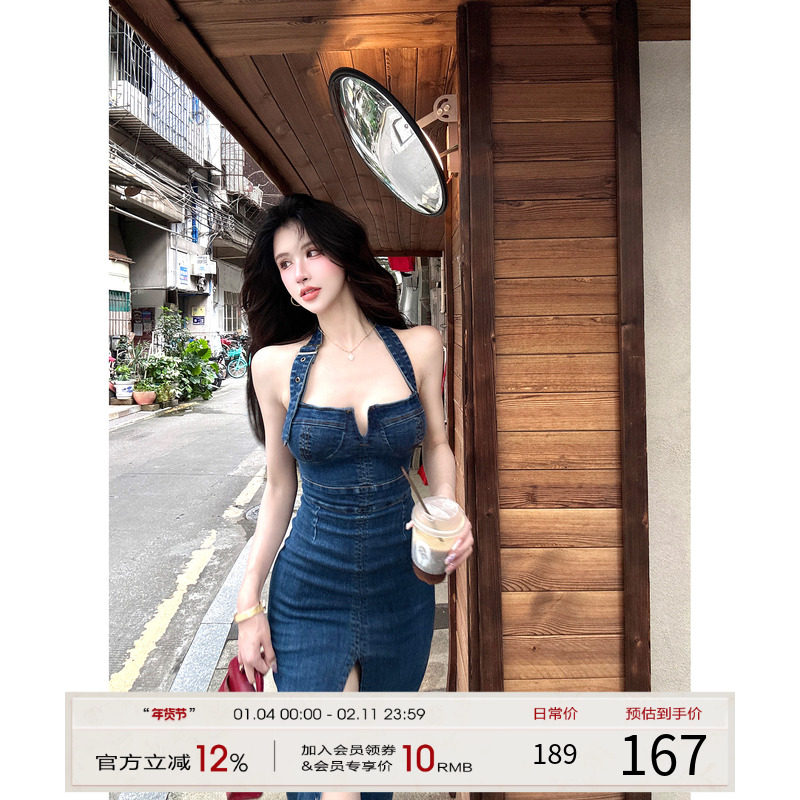 【现货】灰尘邓邓 牛仔挂脖连衣裙秋季辣妹包臀牛仔裙抹胸长裙子