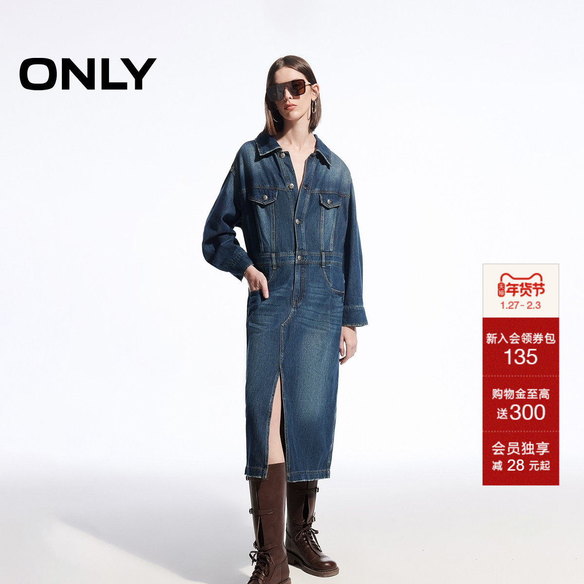 ONLY秋季时尚通勤做旧直筒中长裙牛仔连衣裙女|124442007