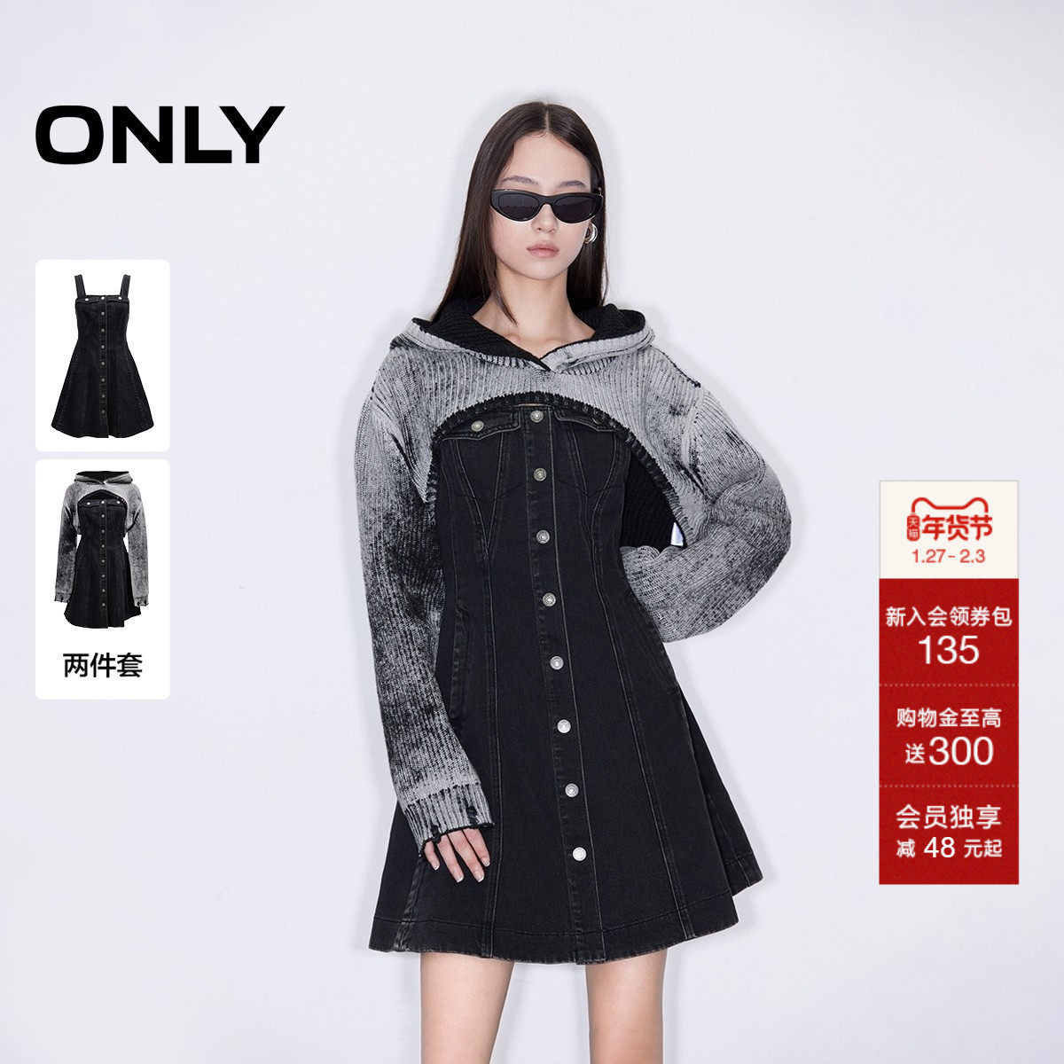 ONLY秋季设计感牛仔吊带短裙针织套装连衣裙女|124442001