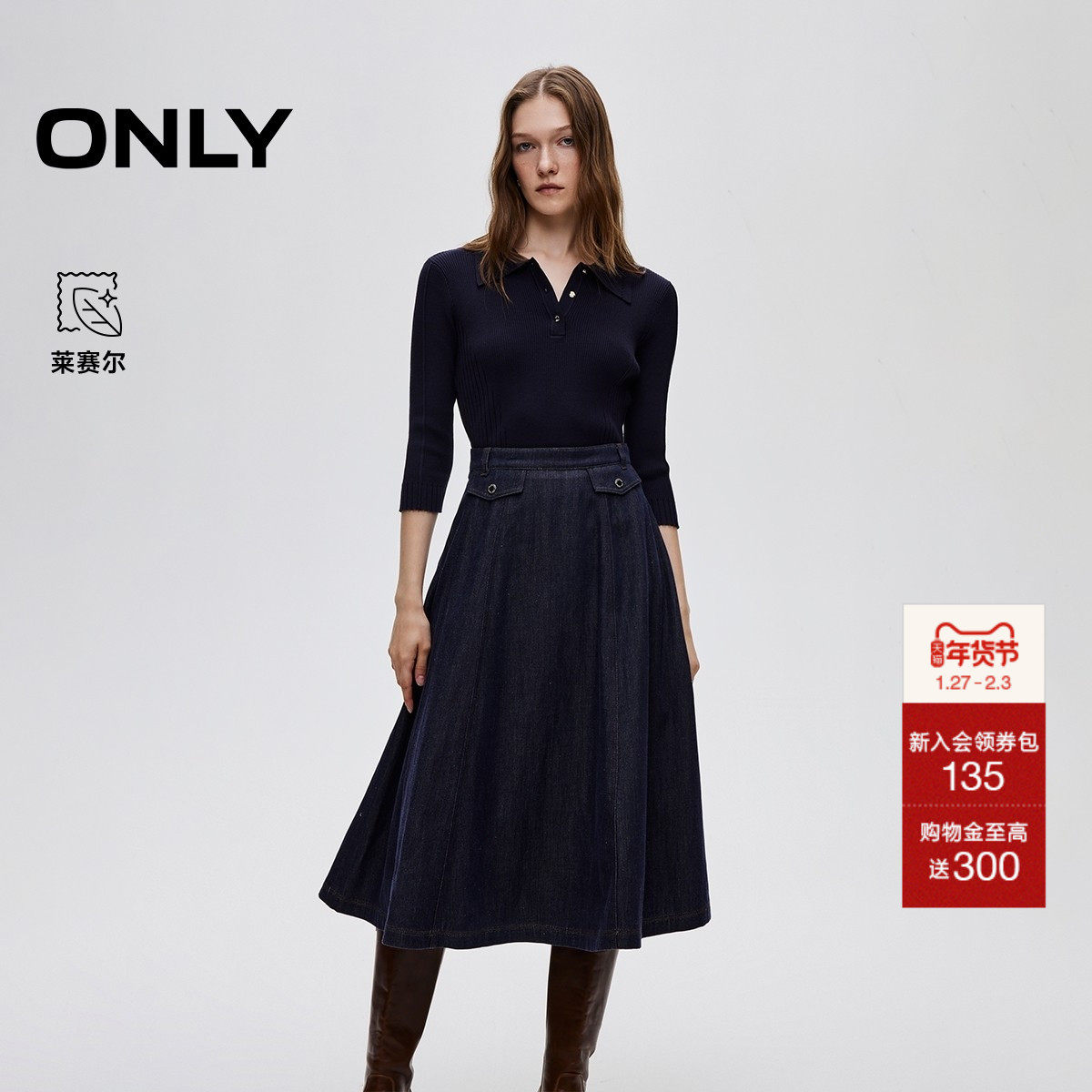 ONLY2025秋季新款莱赛尔收腰修身A字伞裙针织牛仔拼接连衣裙女