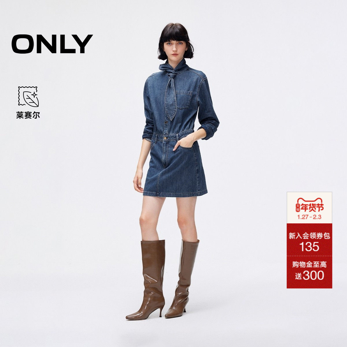 ONLY2025秋季新款法式优雅领结水洗正肩假两件短裙牛仔连衣裙女