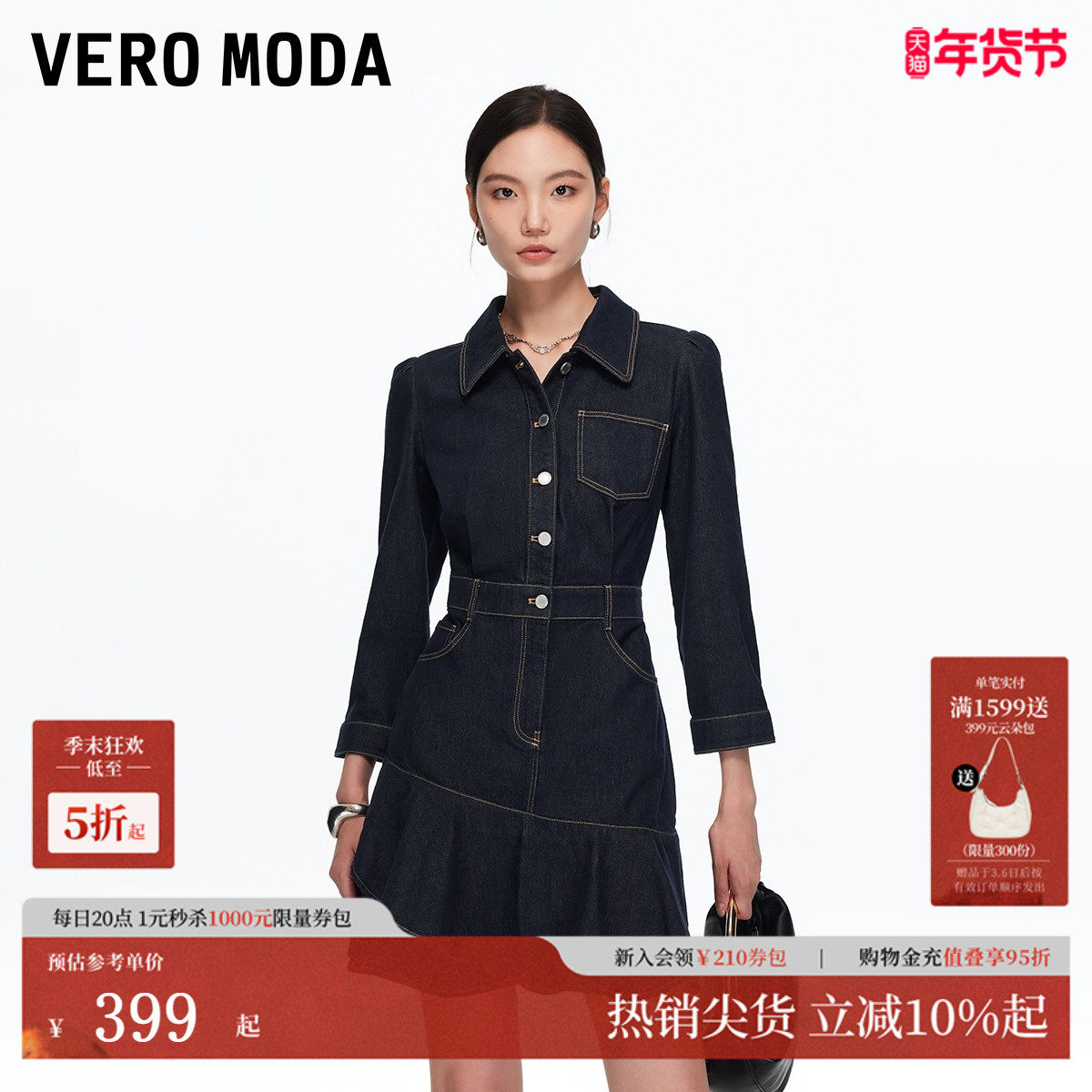 Vero Moda连衣裙2025秋季新款含棉同色腰带收腰裙牛仔风325342012
