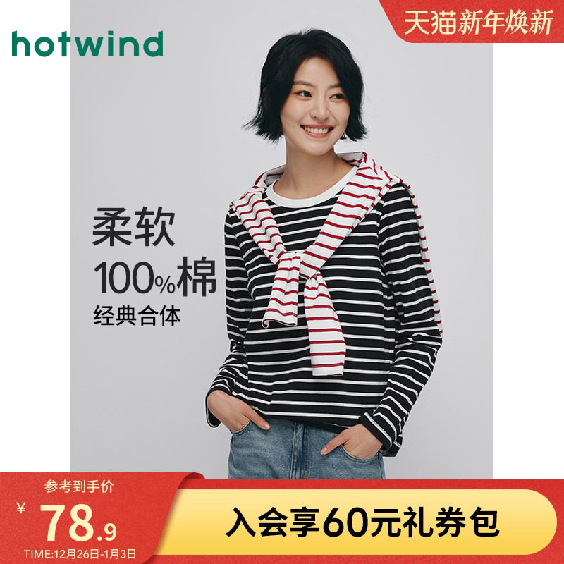 热风女士圆领长袖T恤基础白色内搭2025年秋季新款黑白条纹内搭T恤