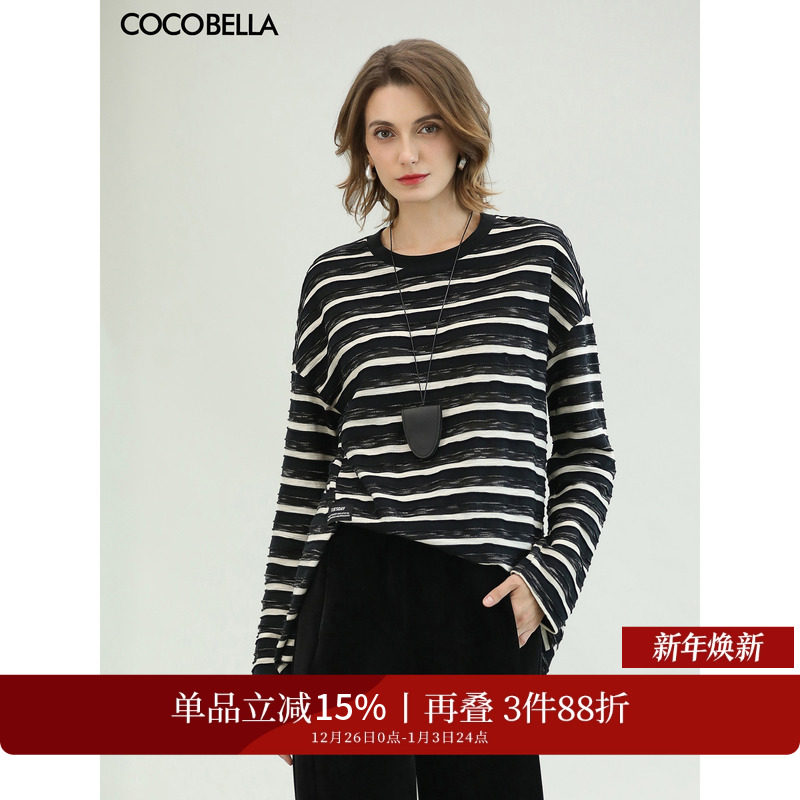 COCOBELLA段彩黑白条纹休闲长袖T恤女侧开叉通勤宽松上衣TS99
