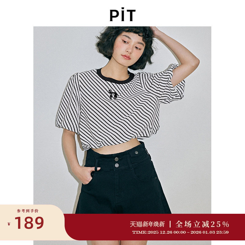 PIT复古条纹T恤黑白条纹上衣女2025夏季新款泡泡袖正肩短袖小衫