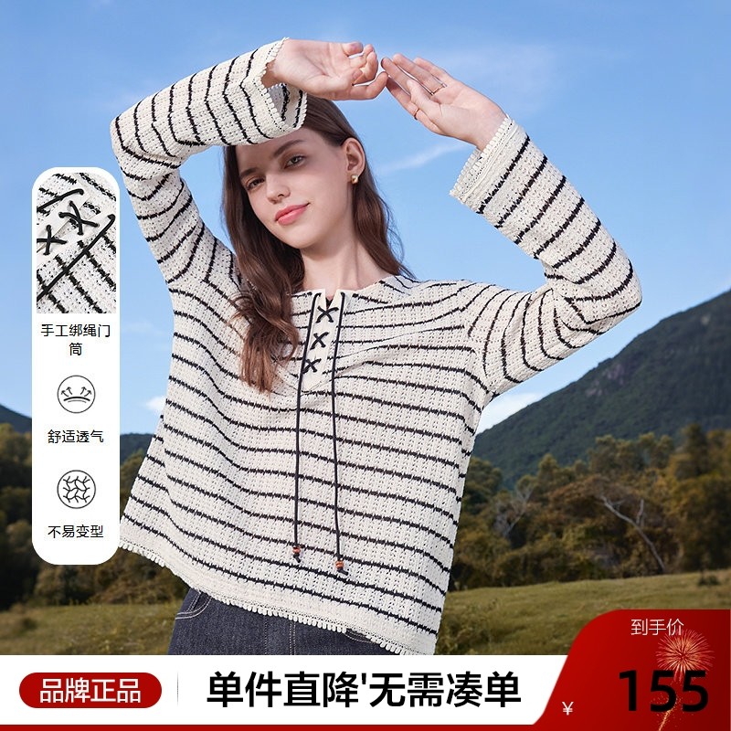 betu百图镂空黑白条纹T恤女长袖2025年秋季新款系带宽松薄款罩衫