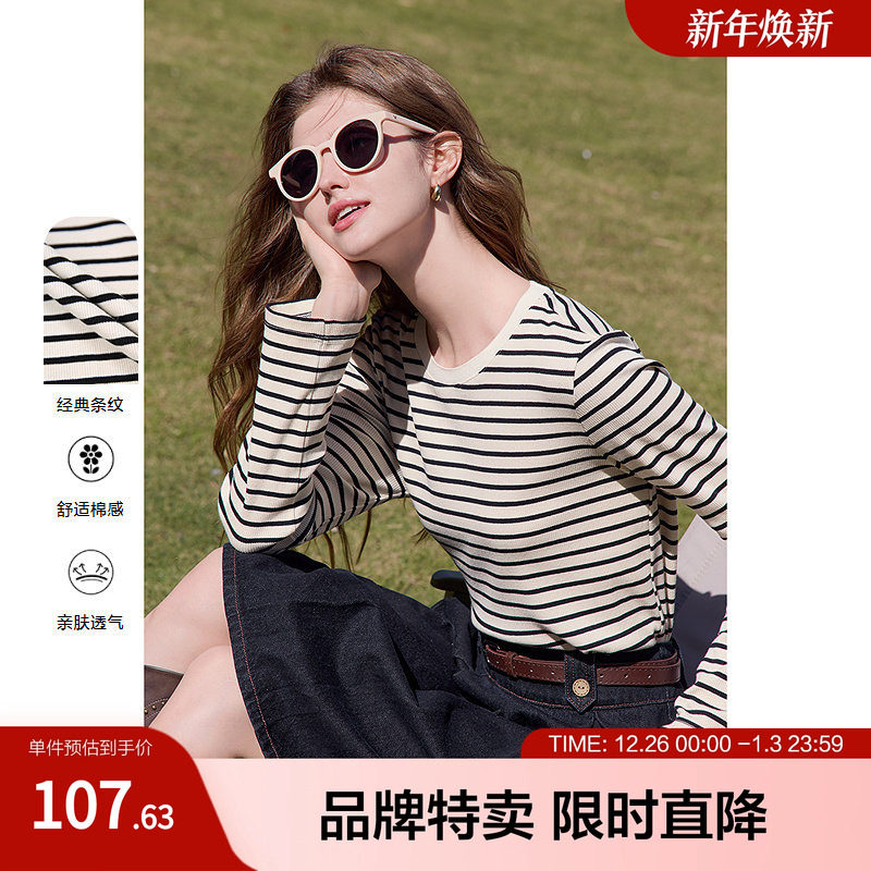 Basic House/百家好黑白条纹长袖T恤女2025秋冬新款纯棉打底上衣