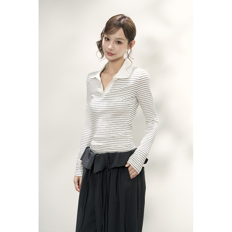 AXIA长袖T恤女秋季V领polo衫黑白条纹修身显瘦正肩上衣早秋打底衫