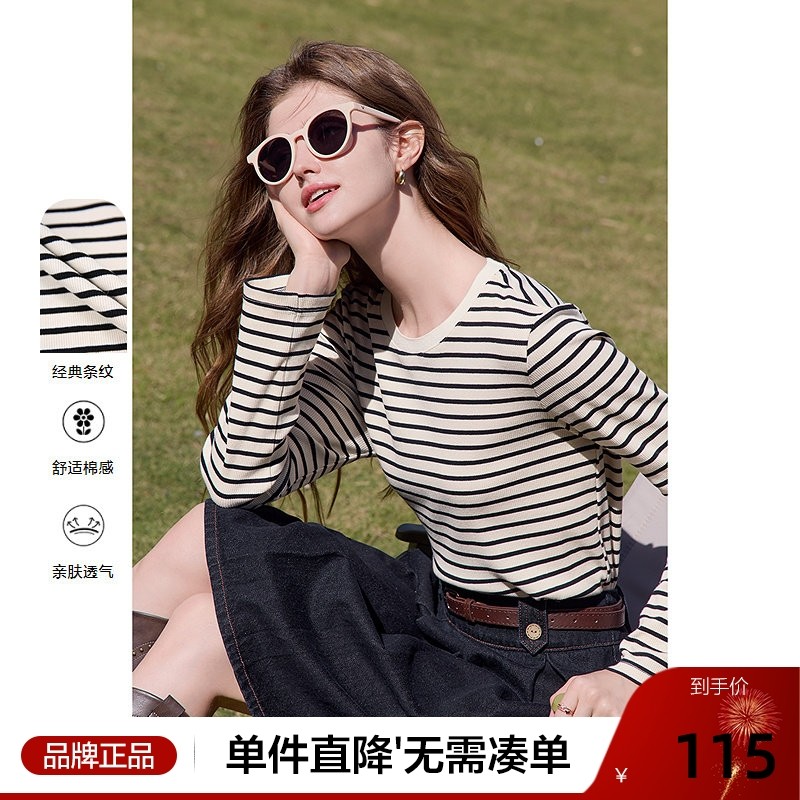 betu百图黑白色条纹圆领T恤女士长袖2025年春季新款弹力棉上衣