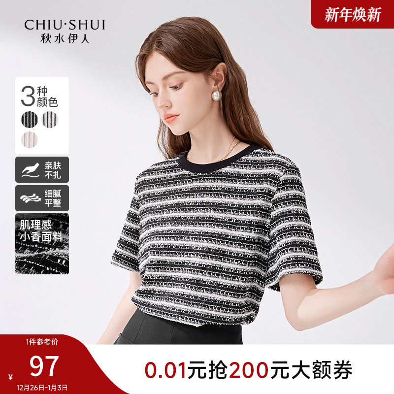 秋水伊人高级圆领短袖T恤女夏季新款小香风通勤黑白条纹夏日上衣
